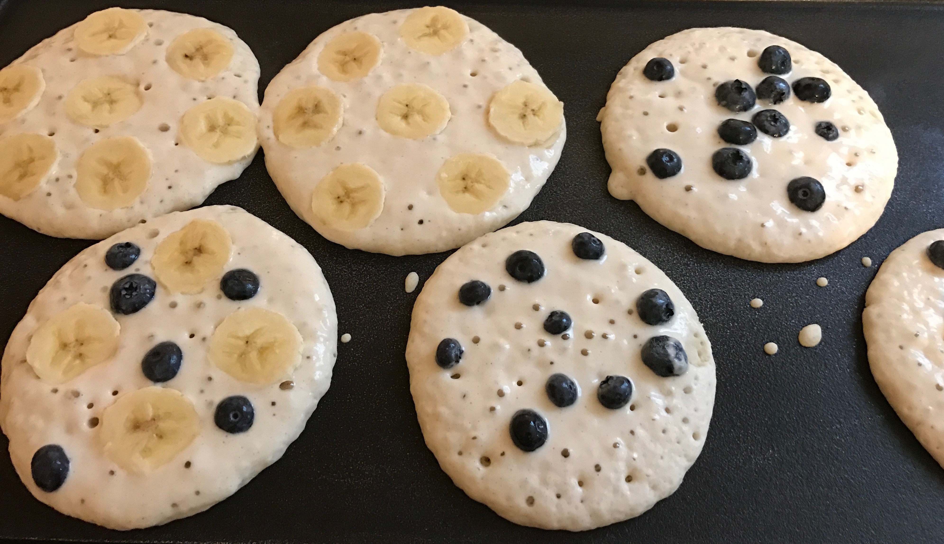 ➌ Pour an appropriate amount of batter into the pan. Sprinkle chocolate chips (bananas, blueberries etc.) onto each pancake. Cook about 2-3 minutes per side or until cooked all the way through. Repeat until there is no more batter.