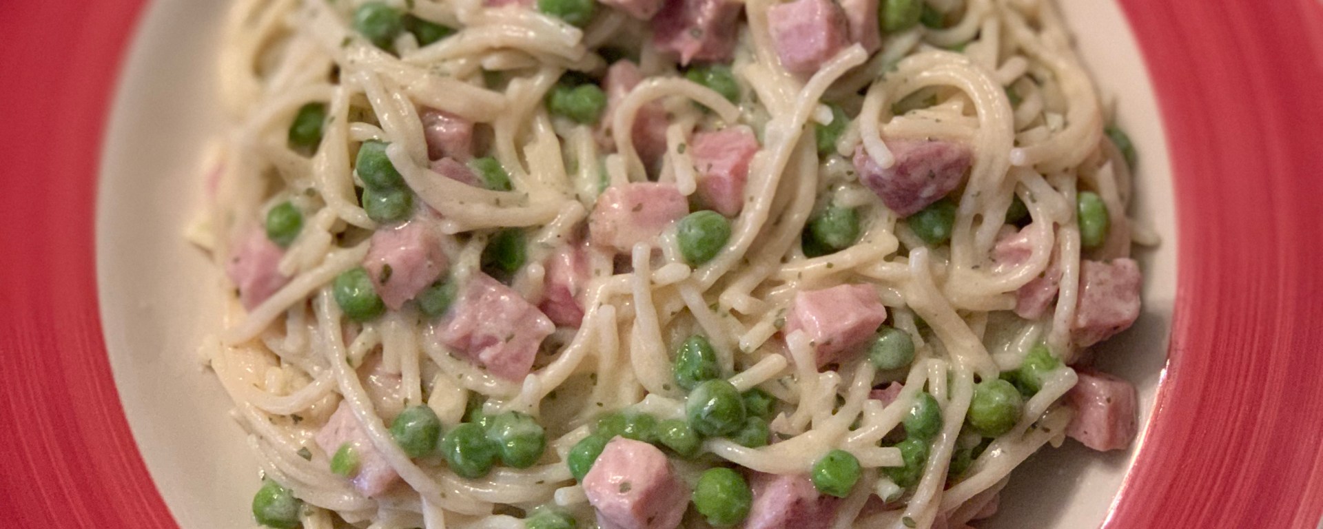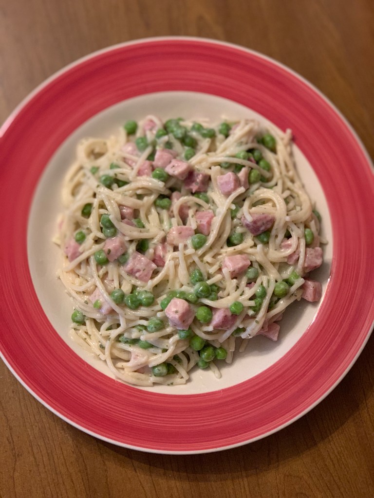 ➍ Mix the Alfredo sauce, pasta, peas, and ham.